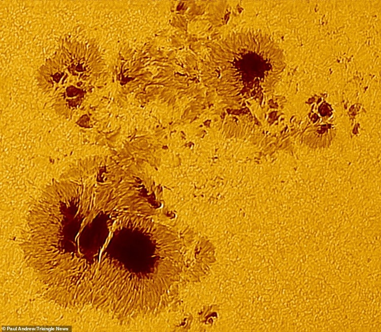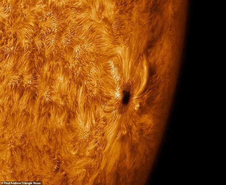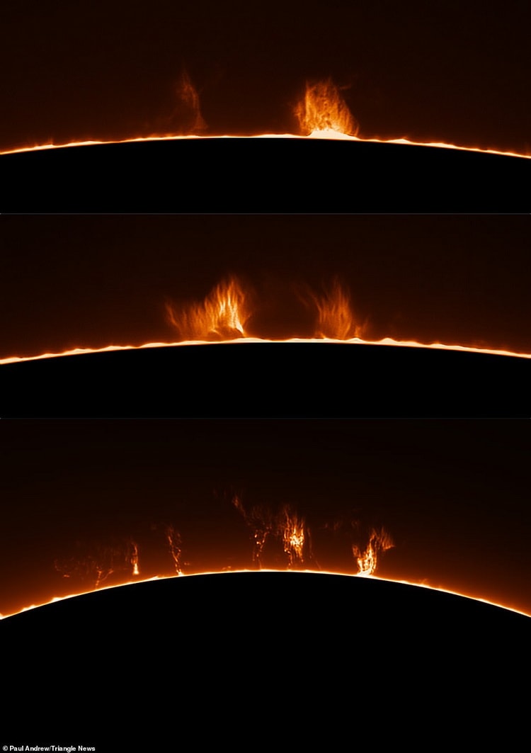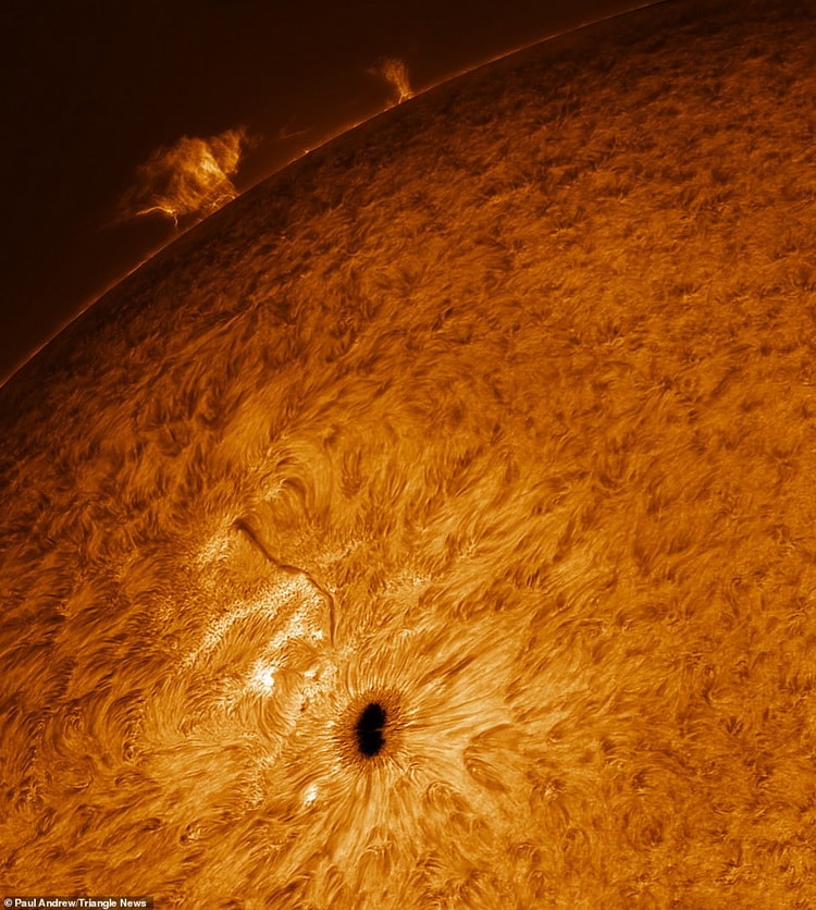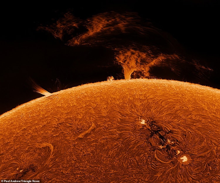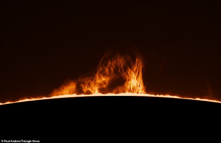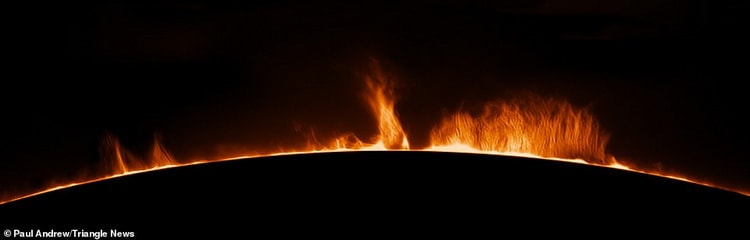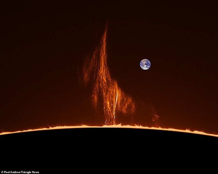 «پائول اندرو» یک مدرس ۶۶ ساله بازنشسته رشته عکاسی است که از باغ خود در شهر "کنت" (Kent) انگلیس تصاویر زیبایی از سطح خورشید به ثبت رسانده است. این عکسها سطح بینظم خورشید را نشان میدهد که بیش از ۹۲ میلیون مایل از ما فاصله دارد. نکتهای که در تصاویر قابل مشاهده است، فورانها و پرتابهای شدید پلاسما از سطح خورشید است که در پسزمینه آنها فضاهای عمیق سیاه قرار دارد. اندرو اظهار کرد، بهترین زمان برای ثبت این تصاویر از خورشید در طول تابستان است. زمانی که خورشید در بالای آسمان قرار دارد. وی گفت: من معمولا در زمانهایی که هوا آفتابی است، از تلسکوپم برای عکسبرداری استفاده میکنم و اصولا نمیتوانم در طول زمستان این تصاویر را ثبت کنم. اندرو ادامه داد، خورشید همیشه در حال تغییر است و من هرگز نمیدانم چه وجههای از آن را خواهم دید. وی پس از بازنشستگی از دانشگاه کنت در رشته عکاسی، علاقه خود را به هنر و نجوم با هم ترکیب کرد. اندرو معتقد است که عکاسی از خورشید مملو از سختیهای فنی است و ثبت تصاویر آن به شانس هم بستگی دارد چرا که این ستاره مدام در حال تغییر است. در اینجا تعدادی از این عکسهای ثبت شده را مشاهده میکنید: برای درک عظمت و بزرگی این فوارانهای خورشیدی، در یکی از عکسهای «پائول اندرو»، کره زمین برای مقایسه بهتر، به عکس اضافه شده است: مونتاژ کره زمین برای مقایسه با عظمت خورشید