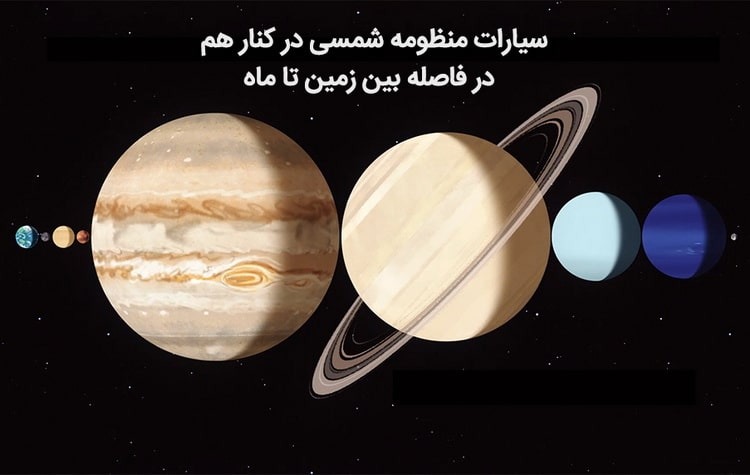 فاصله ماه تا زمین بر حسب واحدهای مختلف: - برحسب کیلومتر: ۳۸۴,۴۰۰ کیلومتر - برحسب مایل: ۲۳۸,۹۰۰ مایل - بر حسب ثانیه نوری: ۱/۲۸ ثانیه نوری - بر حسب سال نوری: ۸-۱۰×۴/۰۶۳ سال نوری شاید به نظر برسد فاصله ماه تا زمین خیلی زیاد نیست. همه ما هم تا حدودی نسبت به بزرگی سیاراتی مثل مشتری و زحل، اطلاعاتی داریم. اما آیا میدانستید اگر همه سیارات منظومه شمسی (غیر از زمین) را پشت سر هم در فاصله بین زمین تا ماه قرار دهیم، باز هم هنوز جا داریم؟! در اینجا قطر (تقریبی) سیارات منظومه شمسی را با هم جمع کردهایم: عطارد (مرکوری): ۴,۸۷۹ کیلومتر زهره (ونوس): ۱۲,۱۰۴ کیلومتر مریخ (بهرام): ۶,۷۷۱ کیلومتر مشتری (برجیس یا ژوپیتر): ۱۳۹,۸۲۲ کیلومتر زحل (کیوان): ۱۱۶,۴۶۴ کیلومتر اورانوس: ۵۰,۷۲۴ کیلومتر نپتون: ۴۹,۲۴۴ کیلومتر جمع کل: ۳۸۰,۰۰۸ کیلومتر در حالیکه فاصله ماه تا زمین برابر ۳۸۴,۴۰۰ کیلومتر است و هنوز ۴,۳۹۲ کیلومتر هم جای خالی داریم! حتی اگر پلوتو - دوست قدیمی - هنوز جزء منظومه شمسی بود (به قطر ۲,۳۷۶ کیلومتر)، میتوانست در این فاصله قرار گیرد و باز هم جا داشتیم! از این به بعد به آسمان که نگاه میکنیم میدانیم فاصلهمان تا ماه آنقدرها هم که به نظر میرسد کم نیست! تکمیلی: مطالبی برای دوستداران ماه - اگر میخواهید اندازه و بزرگی ماه را با سایر قمرهای منظومه شمسی مقایسه کنید، مقاله ماه زمین در مقایسه با سایر قمرهای منظومه شمسی را بخوانید. - آیا تا به حال، ماه را در طیفهای مختلف امواج الکترومغناطیسی دیدهاید؟ اگر نه، پیشنهاد میکنیم مقاله ماه در طولموجهای متفاوت را هم بخوانید.