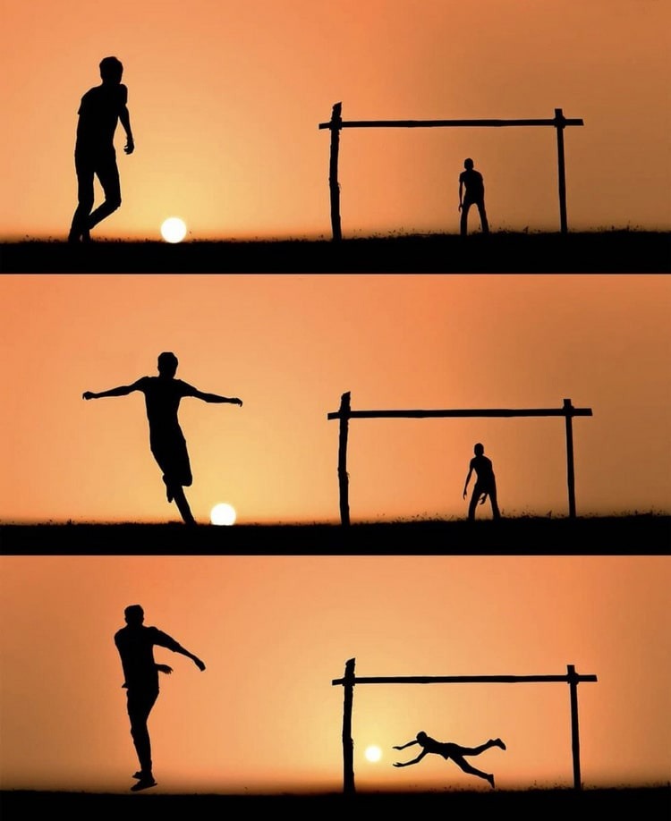 دو نفر مشغول بازی هستند. یکی از آنها قصد دارد پنالتی بزند و بازیکن دیگر درون دروازه قرار گرفته. ضربه زده میشود اما نه به توپ، بلکه به خورشید! به نظر شما آیا بازیکن موفق میشود خورشید را مهار کند و مانع از گل شدنش شود؟!