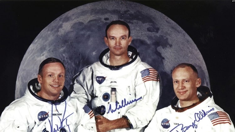 در روز ۱۶ ژوئیه ۱۹۶۹ نیل آرمسترانگ، باز آلدرین و مایکل کالینز با فضاپیمای آپولو سوار بر موشک «ساترن ۵» ابتدا ظرف ۱۱ دقیقه به مدار زمین رسیدند. چهار روز بعد آرمسترانگ و آلدرین اولین انسانهایی بودند که روی سطح ماه پا میگذاشتند. کالینز در طول این ماموریت در واحد فرمان در مدار باقی ماند.