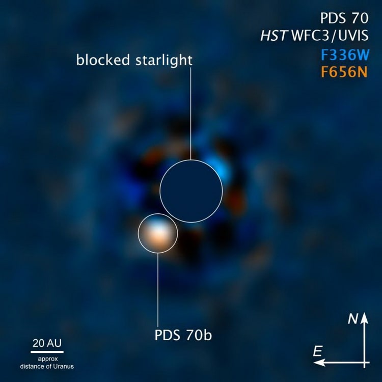 اولین تصویر واضح از سیاره در حال شکلگیری PDS 70b در سال ۲۰۱۸ که در اطراف یک ستاره کوتوله قرار دارد. این سیاره به عنوان یک نقطه روشن در سمت راست مرکز تصویر دیده میشود.