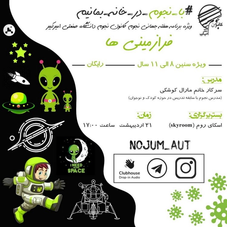 کانون نجوم دانشگاه صنعتی امیرکبیر به مناسبت هفته جهانی نجوم، وبینار «فرازمینیها» ویژهبرنامه کودکان را برگزار میکند.