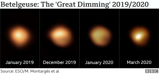 «اِبط الجوزا» یا «بیتل‌جوس» یکی از درخشان‌ترین ستاره‌های آسمان شب است. در اواخر سال ۲۰۱۹ ستاره‌شناسان شاهد کاهش درخشش بودند، به گونه‌ای که گویا این ستاره به کمتر از یک سوم روشنایی معمول خود کم نور شد و این موارد گمانه زنی‌هایی را در مورد انفجار آن ایجاد کرد.