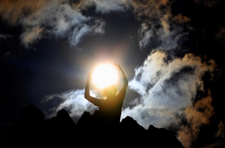تصویری از یکی از دوستداران «انقلاب تابستانی» (Summer solstice) در نزدیکی رصدخانه سنگی کوکینو (Kokino megalithic observatory)، حوالی شهر کومانوو در مقدونیه شمالی در تاریخ ۲۱ ژوئن ۲۰۲۱ جشن میگیرد. او به شکلی نمایشی و طنزآمیز میکوشد، خورشید را در دستان خود بر روی سرش بگیرد و نگه دارد.