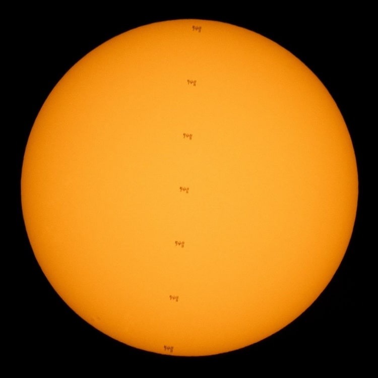 در این تصویر، ایستگاه فضایی بینالمللی هنگام گذر از خورشید با سرعت تقریباً پنج مایل بر ثانیه (۸ کیلومتر بر ثانیه)، به صورت شبح دیده میشود. این تصویر ترکیبی از هفت تصویر ثبت شده در روز جمعه، ۲۵ ژوئن ۲۰۲۱ از نزدیک نلیسفورد (Nellysford) ویرجینیا است.
