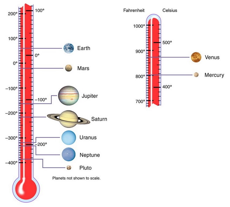 - عطارد (تیر/ مرکوری): در طول روز: °۴۳۰ سانتیگراد (°۸۰۰ فارنهایت) | در طول شب: °۱۸۰- سانتیگراد (°۲۹۰- فارنهایت)