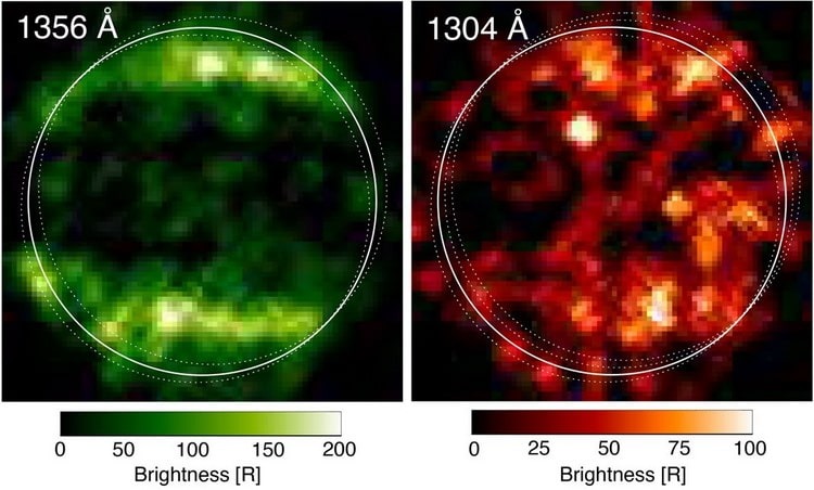 شباهتهای موجود در تصاویر فرابنفش نشان از وجود گاز اکسیژن در این سیاره داشت اما برخی دیگر از مشاهدات وجود اکسیژن خالص را رد میکرد بنابراین دانشمندان نتیجه گرفتند که علت آن میتواند وجود مقادیر زیادی از اتم O باشد. بررسیهای انجام شده در سال ۲۰۱۸ نشان داد که برخلاف تصور وجود اکسیژن در جو گانیمد بعید به نظر میرسد و بنابراین باید توضیح دیگری برای وجود تفاوتهای موجود در تصاویر فرابنفش وجود داشته باشد.