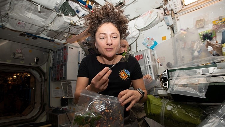 در این تصویر "جسیکا میر" (Jessica Meir) فضانورد مستقر در "ایستگاه فضایی بینالمللی" (ISS) قابل مشاهده است که در دستان خود "خردل سبز میزونا" دارد. "جسیکا میر" خودش این محصول را در فضا برداشت کرده است.