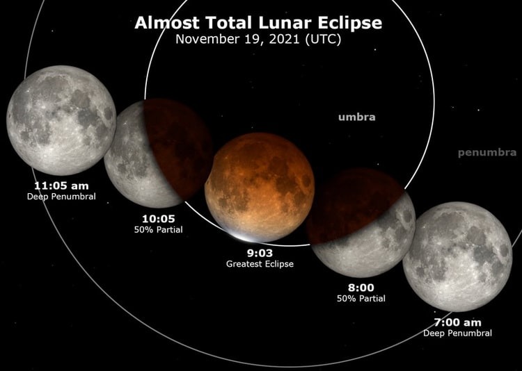در اولین ساعات ۱۹ نوامبر (۲۸ آبان)، زمین از میان ماه و خورشید عبور خواهد کرد و سایه خود را بر ماه خواهد انداخت. این ماه‌گرفتگی در ساعت چهار صبح به وقت منطقه زمانی شرقی (۱۱:۳۰ تهران) به اوج خود می‌رسد در این لحظه سیاره ما ۹۷ درصد از ماه را پنهان خواهد کرد و ماه ظاهری سرخ ‌رنگ پیدا می‌کند.
