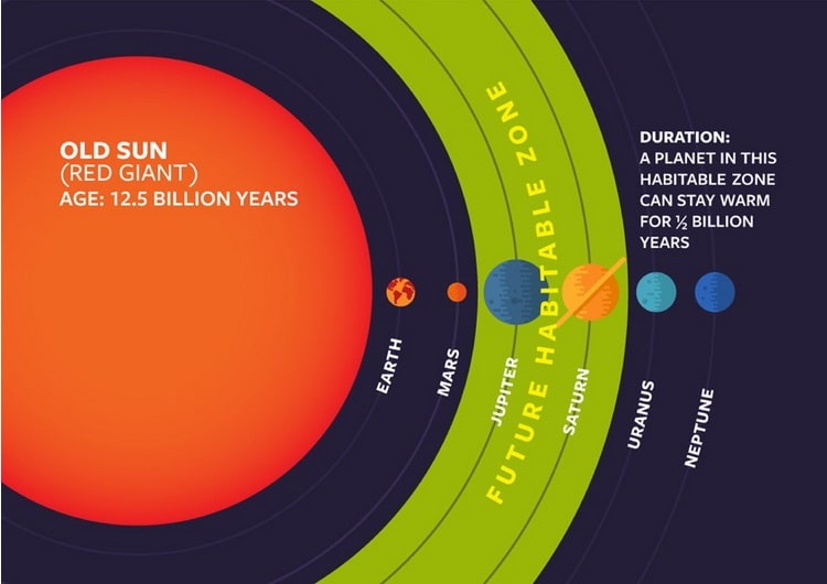 بخیر گذشت؟! اگرچه زمین را نبلعیده، ولی بخاطر حرارت وحشتناکی که نصیب کره زمین میشود، تقریبا هیچ موجود زندهای را باقی نمیگذارد. اما کمربند حیات، به سمت مشتری (ژوپیتر) و زحل به عقب میرود. شاید آن روزها این دو سیاره غول پیکر، شرایطی برای حیات پیدا کنند! کسی چه میداند!