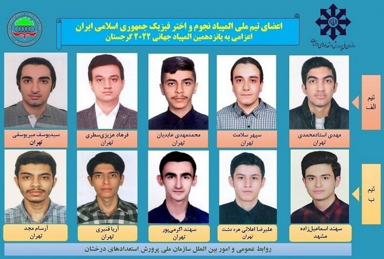 اعضای تیم ملی المپیاد نجوم و اختر فیزیک کشورمان برای شرکت در پانزدهمین المپیاد جهانی ۲۰۲۲ معرفی شدند. باشگاه دانش پژوهان جوان اعضای تیم ملی المپیاد نجوم و اختر فیزیک ایران را جهت شرکت در پانزدهمین المپیاد جهانی ۲۰۲۲ اعلام کرد. تیم الف: مهدی استادمحمدی (استان تهران) سپهر سلامت (استان تهران) محمدمهدی عابدیان (استان تهران) فرهاد عزیزی سطری (استان تهران) سیدیوسف میریوسفی (استان تهران) تیم ب: سهند اسماعیل زاده (استان خراسان رضوی) علیرضا اعلائی هره دشت (استان تهران) سهند اکرمی پور (استان تهران) آریا قنبری (استان تهران) آرسام مجد (استان تهران) پانزدهمین المپیاد جهانی نجوم و اخترفیزیک سال جاری از ۲۲ تا ۳۱ مردادماه به میزبانی کشور گرجستان برگزار می شود. دانش پژوهان ایرانی در چهاردهمین المپیاد جهانی نجوم و اخترفیزیک سال ۲۰۲۱ که از ۲۳ تا ۲۸ آبان ماه ۱۴۰۰ با شرکت ۴۸ کشور جهان با میزبانی کشور کلمبیا و به صورت آنلاین برگزار شد، به ۲ مدال طلا، ۵ مدال نقره، ۲ مدال برنز و یک دیپلم افتخار دست یافتند.