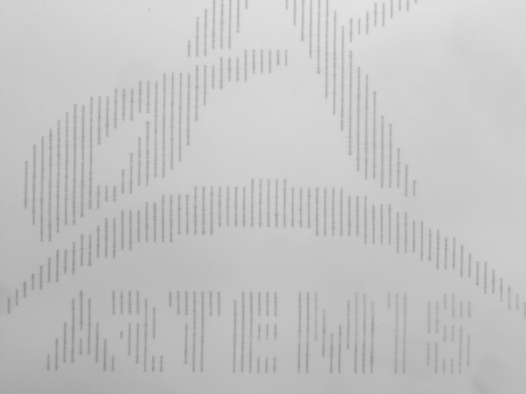 لیتوگرافی یا چاپ سنگی یا طرحنگاری، گونهای چاپ مکانیکی شامل استفاده از صفحههای عکاسی یا سایر صفحههای مشابه است. زدایش یون-غیرفعال یکی از روشهای زدایش یا برش مواد در ساختارهای ریز و زیرمجموعهای از روشهای زدایش پلاسما است. لانگ میگوید: من بسیار سریع فهمیدم که چگونه این کار را انجام دهم و تصمیم گرفتم نامها را طوری قرار دهم که وقتی آن را میبینید، شبیه لوگوی ناسا، آرتمیس و آژانس فضایی اروپا باشد. هر لوگو از ۳۰ هزار نام ساخته شده است.