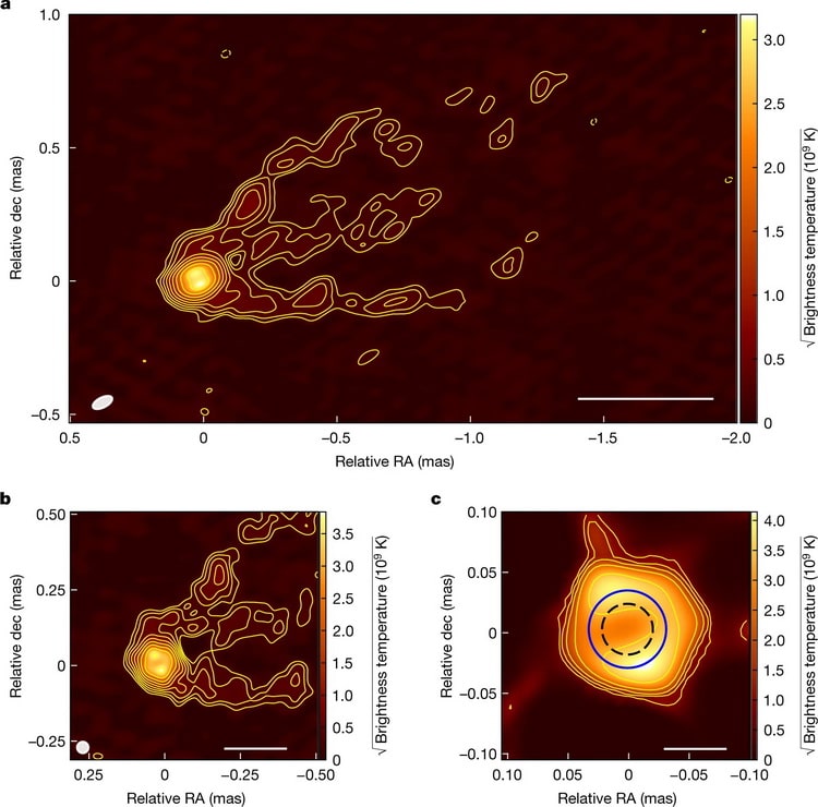 این تصویر جدید علاوه بر نشان دادن فواره هنگام بیرون آمدن از این ابرسیاهچاله، آنچه را دانشمندان سایه سیاهچاله مینامند را نیز نشان میدهد. همانطور که ماده به لطف تأثیر گرانشی فوق العاده این هیولای کیهانی با سرعت نزدیک به نور به دور ابرسیاهچاله میچرخد، ماده گرم میشود و میدرخشد.