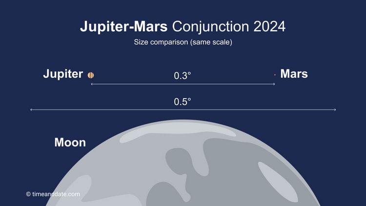 برای اکثر ناظران در آمریکای شمالی و جنوبی، اروپا و آفریقا، این دو سیاره در صبح روز ۲۴ مرداد ۱۴۰۳ (۱۴ آگوست ۲۰۲۴) در نزدیکترین فاصله دیده میشوند. در نزدیکترین فاصله، مریخ و مشتری با فاصله 0.3 درجه از هم جدا خواهند شد. آیا می دانید این فاصله چقدر نزدیک است؟ عرض آن کمتر از عرض یک ماه کامل در آسمان است که حدود 0.5 درجه است!