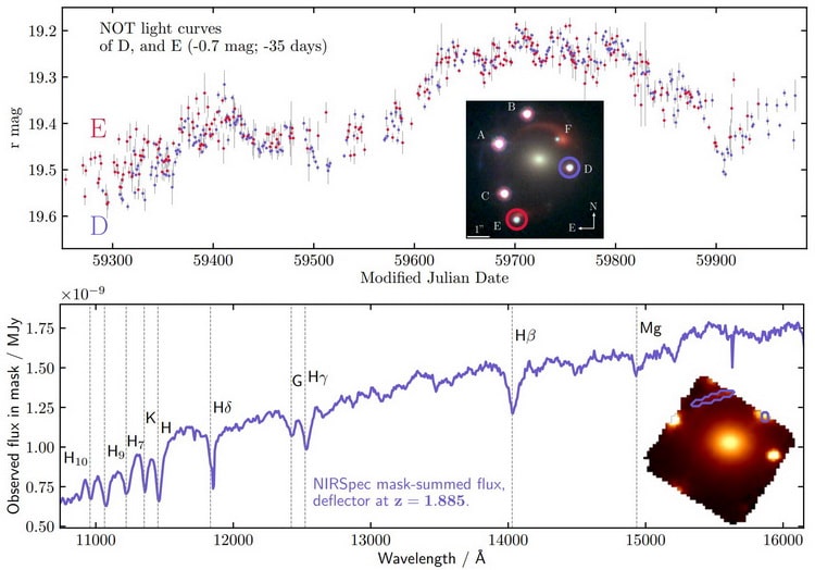 این پیکربندی نادر به محققان این امکان را داد که از دو روش کلیدی شامل «کیهاننگاری با تأخیر زمانی» و «همگرایی دو منبعی» برای مطالعه جهان استفاده کنند. تجزیه و تحلیل دقیقتر نشان داد که شش نقطه نوری با چهار نقطه اصلی مطابقت دارند و تأیید میکنند که همه آنها از یک منبع آمدهاند. مطالعات قبلی نشان داده بود که چنین تصویری میتواند از یک عدسی ترکیبی طبیعی حاصل شود.