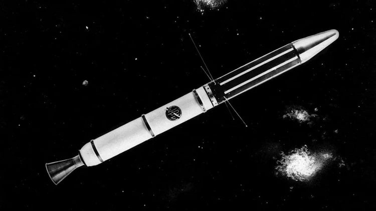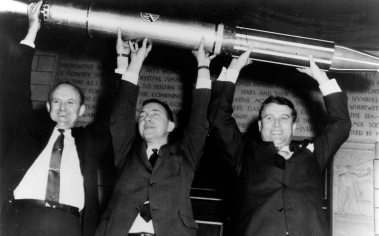 از چپ به راست: پیکرنیگ، ون آلن، فان براون مدل اکسپلورر با سایز واقعی را در دست گرفتهاند.