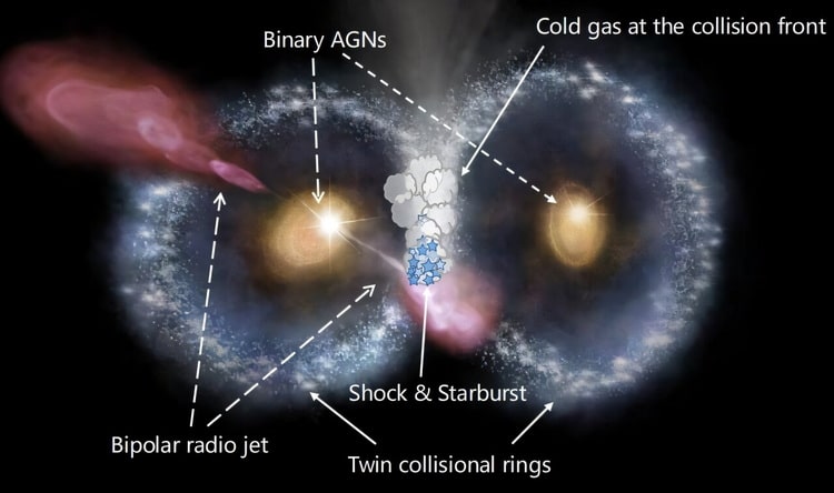 این عکسها نشان دادند که کهکشانها بسیار شبیه به هم هستند. آنها علاوه بر حلقوی بودن، نسبتاً کوچک هستند. هر کدام قطری حدود ۲۶ هزار سال نوری دارند. علاوه بر این، هسته هر کهکشان که با ستارگان قدیمی در اطراف یک ابرسیاهچاله فشرده شده است، چشم جغد را تشکیل میدهد. دادههای دقیق «جیمز وب» نشان میدهد که هر دو سیاهچاله، که هر کدام بیش از ۱۰ میلیون برابر جرم خورشید جرم دارند، به شدت در حال جذب اجرام اطراف خود هستند و هستههای کهکشانی را به «هستههای کهکشانی فعال» (active galactic nuclei) تبدیل میکنند.
