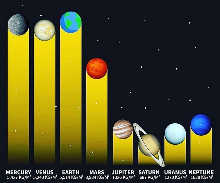 چگالی سیاره‌های منظومه شمسی را در زیر مشاهده می‌کنید: