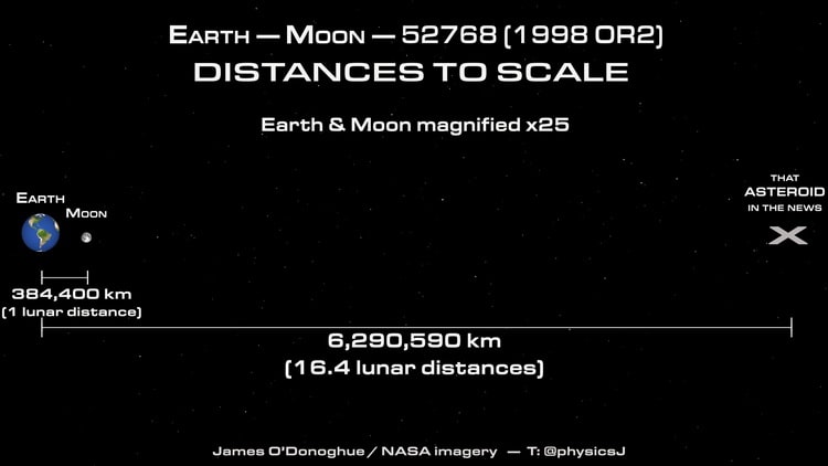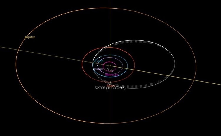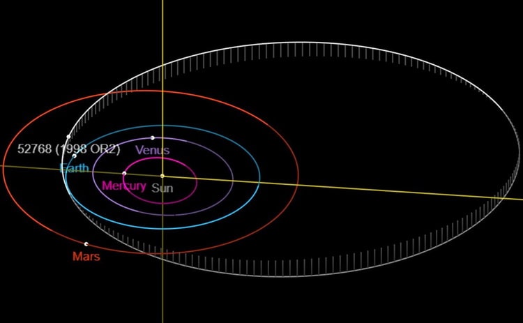 این روزها که جهان درگیر ویروس کرونا (کووید ۱۹) شده، دغدغه بزرگ دیگری نیز افراد مختلف را در بر گرفته: یک شهاب سنگ بزرگ در تاریخ ۱۰ اردیبهشت ۹۹ با کره زمین برخورد خواهد کرد! و آنگونه که دانشمندان میگویند اگر این اتفاق رخ دهد، بشریت به پایان کار خود خواهد رسید. میخواهیم ببینیم آیا این اتفاق خواهد افتاد؟ بگذارید ابتدا روشن کنیم که آنچه در تاریخ ۱۰ اردیبهشت به نزدیکترین فاصلهاش با کره زمین خواهد رسید، نه یک شهاب سنگ بلکه یک سیارک است و بر روی یک مدار در حال گردش است. نام این سیارک، 52768 (1998 OR2) است. در شکل زیر، مقایسه بین فاصله زمین تا ماه و سیارک 1998OR2 در نزدیکترین فاصلهاش با زمین را مشاهده میکنید که در حدود ۱۶.۴ فاصله ماه تا زمین (معادل ۶.۲۹۰.۵۹۰ کیلومتر) است: همانطور که میبینید واقعاً جای هیچگونه نگرانی نیست و این سیارک، با خوبی و خوشی از کنار ما عبور خواهد کرد و احتمالاً تا مدتها برایش دلتنگ خواهیم بود! در تصاویر زیر، زاویه مدار سیارک 1998 OR2 را مشاهده میکنید. حال میخواهیم مشخصات دقیقتری از این سیارک بدانیم: نام سیارک: سیارک 52768 یا 1998OR2 ابعاد: حدود ۴ کیلومتر مدت زمان گردش به دور مدار: ۳.۶۷ سال (۱۳۴۱ روز) فاصله اوج: 3.74228AU فاصله حضیض: 1.0167AU