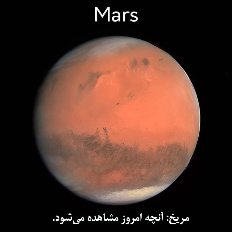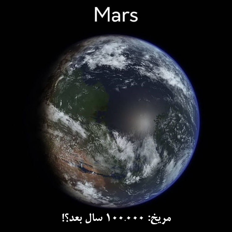 مریخ همواره جزو یکی از جالبترین و اسرارآمیزترین سیارههای منظومه شمسی بوده است. داستانهای زیادی نیز در مورد آن وجود دارد. گمانه زنیهای زیادی در مورد وجود آب (حداقل در گذشته بسیار دور) بر روی مریخ مطرح است و یکی از اهداف بشر این است که در آینده نه چندان دور، شرایط زندگی را بر روی این کره سرخ، فراهم آورد. البته خیلیها هم از همین حالا در آرزوی یک سفر طولانی و بیبازگشت به مریخ هستند. آیا شما نیز هیجان این سفر را دوست دارید؟ و تصویر پایانی ... یکی از مدلهایی است که برای آینده مریخ تصور میشود (حدودا 100.000 سال بعد!) البته ایجاد آب و هوایی مثل زمین بر روی مریخ، بیشتر به یک رویاءپردازی و خیال شبیه است؛ و شاید بد نباشد همانقدر که به فکر ایجاد شرایط مشابه کره زمین در سیارات دیگر هستیم، به مراقبت و محافظت از خود کره زمین هم فکر کنیم!