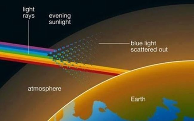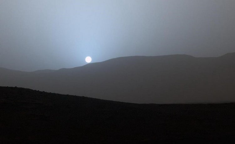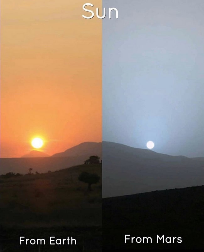 آیا دوست دارید به سیاره سرخ - مریخ - سفر کنید و شاهد غروب آبیرنگ خورشید باشید یا غروب قرمز و نارنجی زمین را ترجیح میدهید؟! علاوه بر فاصله بیشتری که مریخ تا خورشید دارد، اتمسفر کره زمین نیز باعث میشود این تفاوت را احساس کنید. در تصویر زیر، مقایسهای بین غروب خورشید در زمین و غروب آبیرنگ خورشید در مریخ را مشاهده میکنید.در شکل زیر، کره زمین را مشاهده میکنید. غلظت اتمسفر زمین و غبار موجود در آن باعث میشود غروبی نارنجی متمایل به قرمز داشته باشیم و از طیف رنگ آبی خبری نباشد: